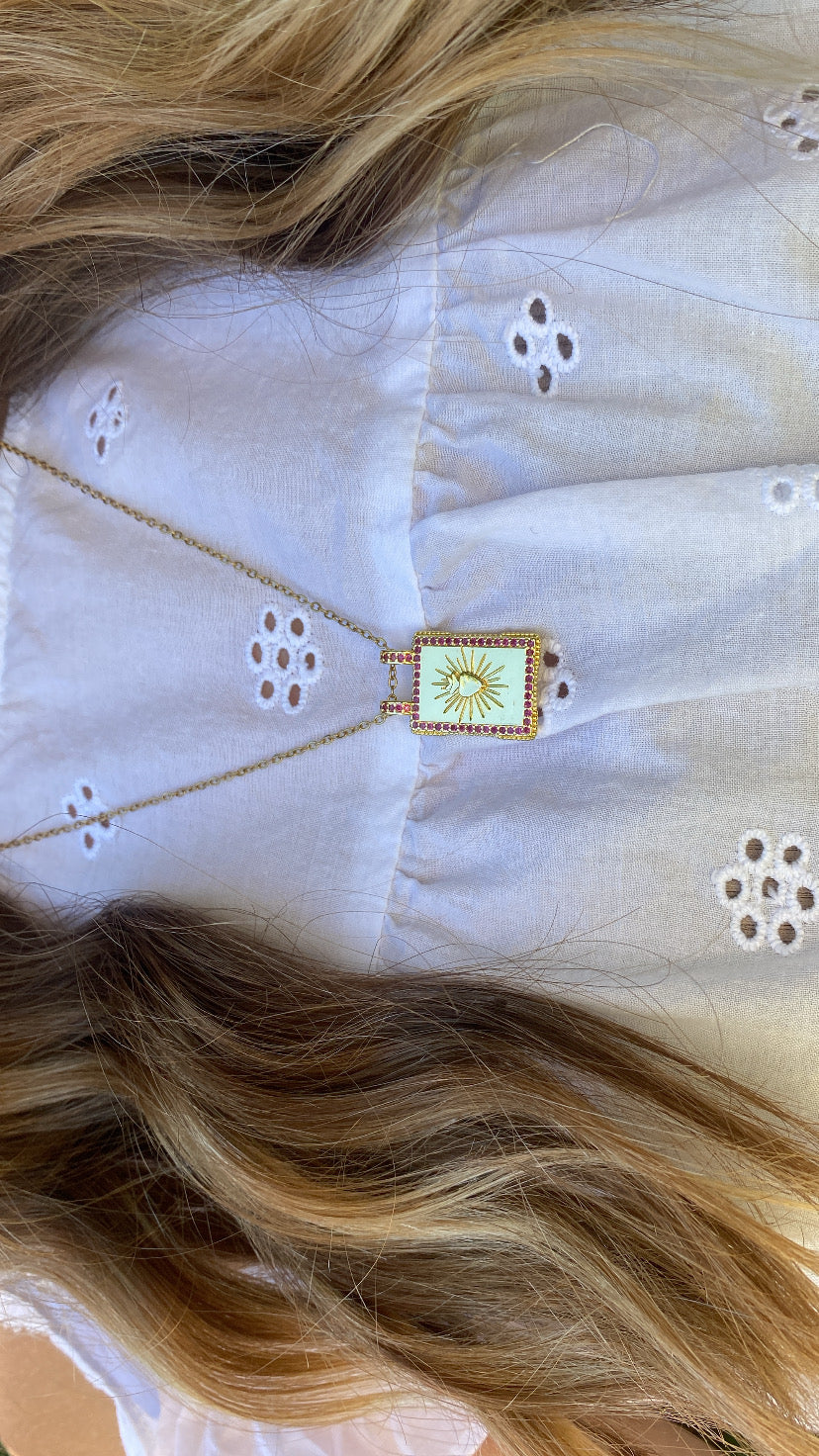Collier Pink Shinny en acier inoxydable et ajustable (50+5cm) avec pendentif plaque cœur à strass roses en plaqué or.