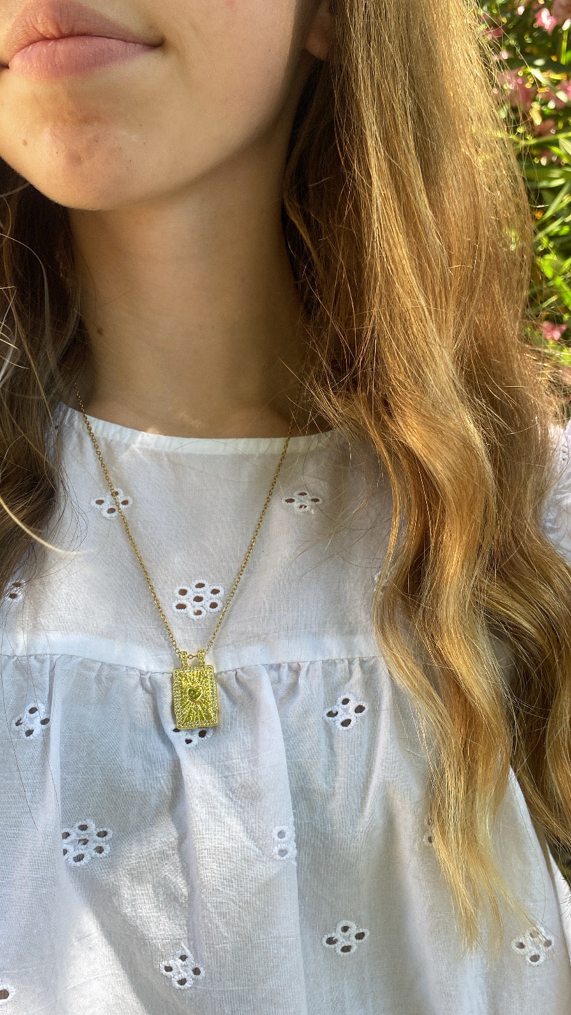 Collier Shinny en acier inoxydable et ajustable (50+5cm) avec pendentif plaque cœur à strass en plaqué or.